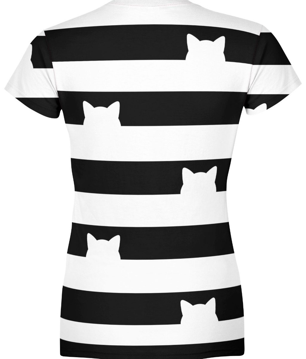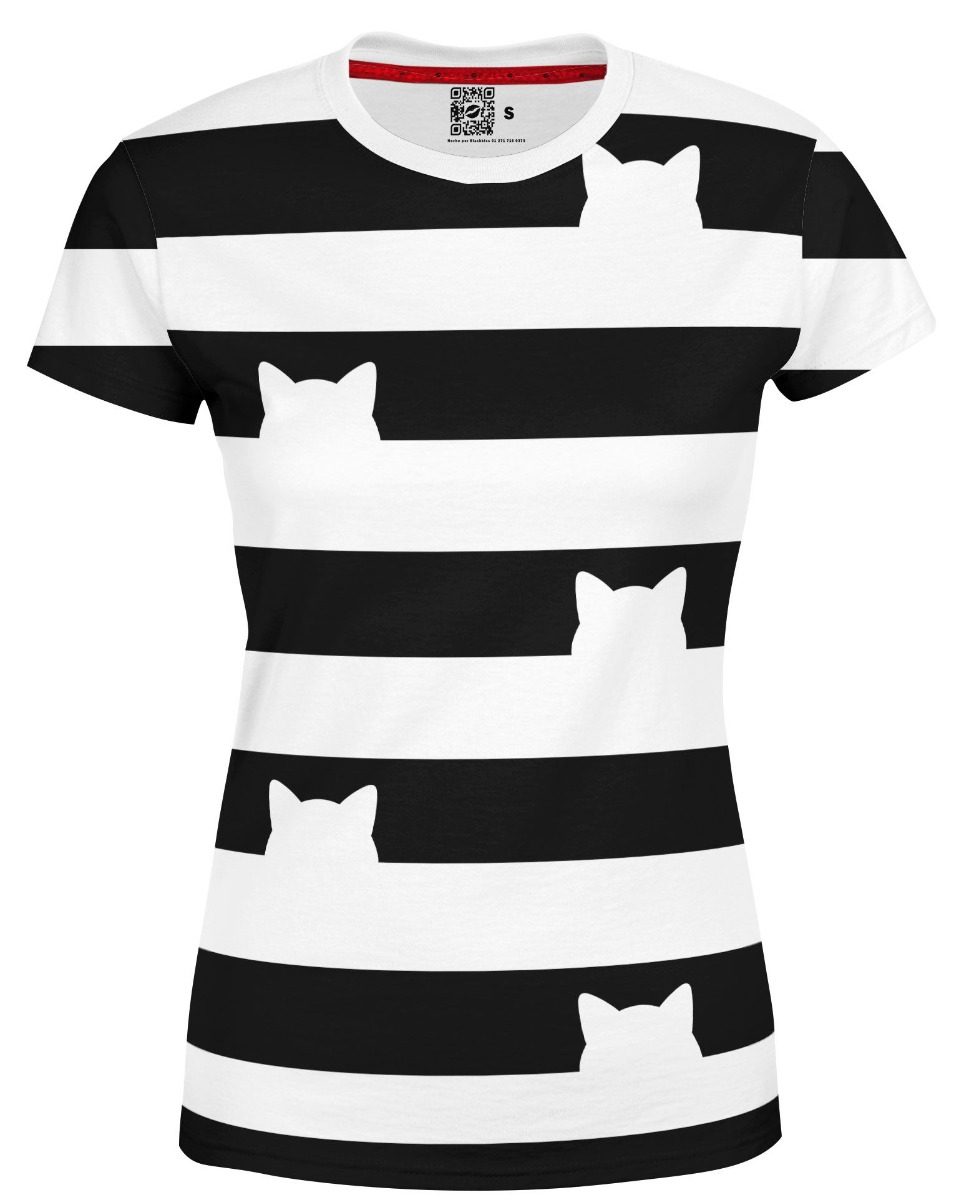 Playera Full Print Dama Rayas Negras Gatitos Blancos