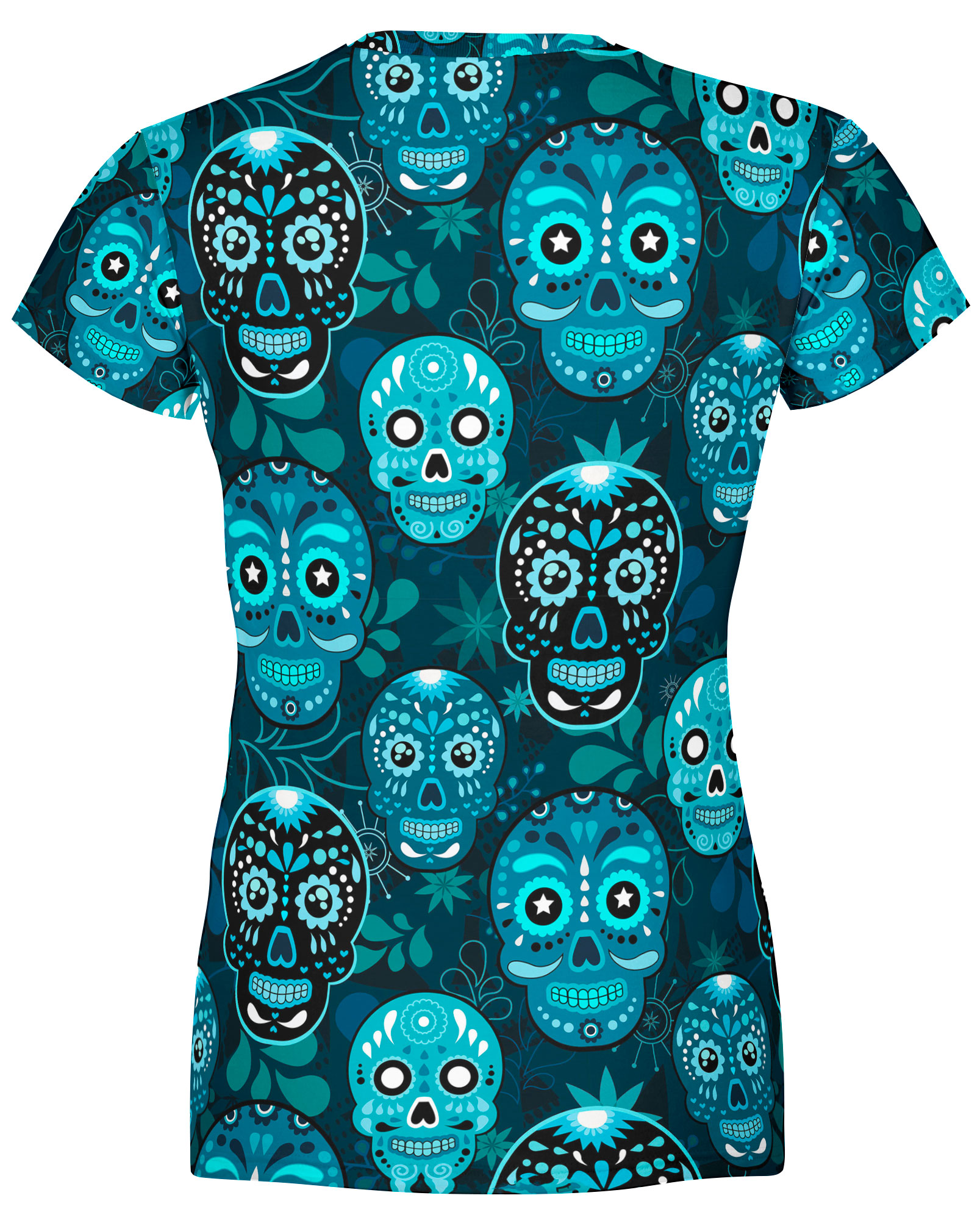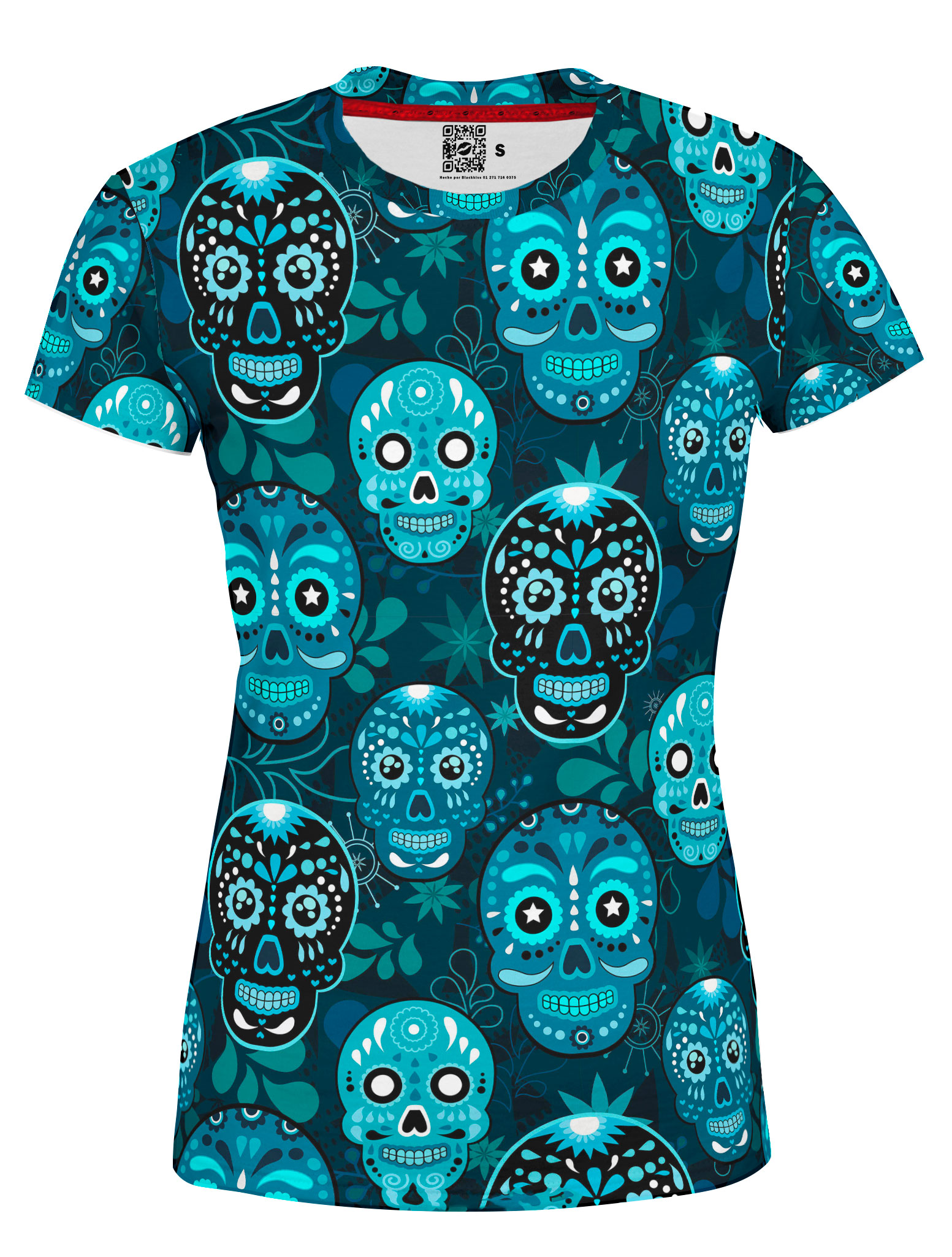 Playera Full Print Dama CALAVERASCOLLAGE DIA DE MUERTOS AZUL PATRON