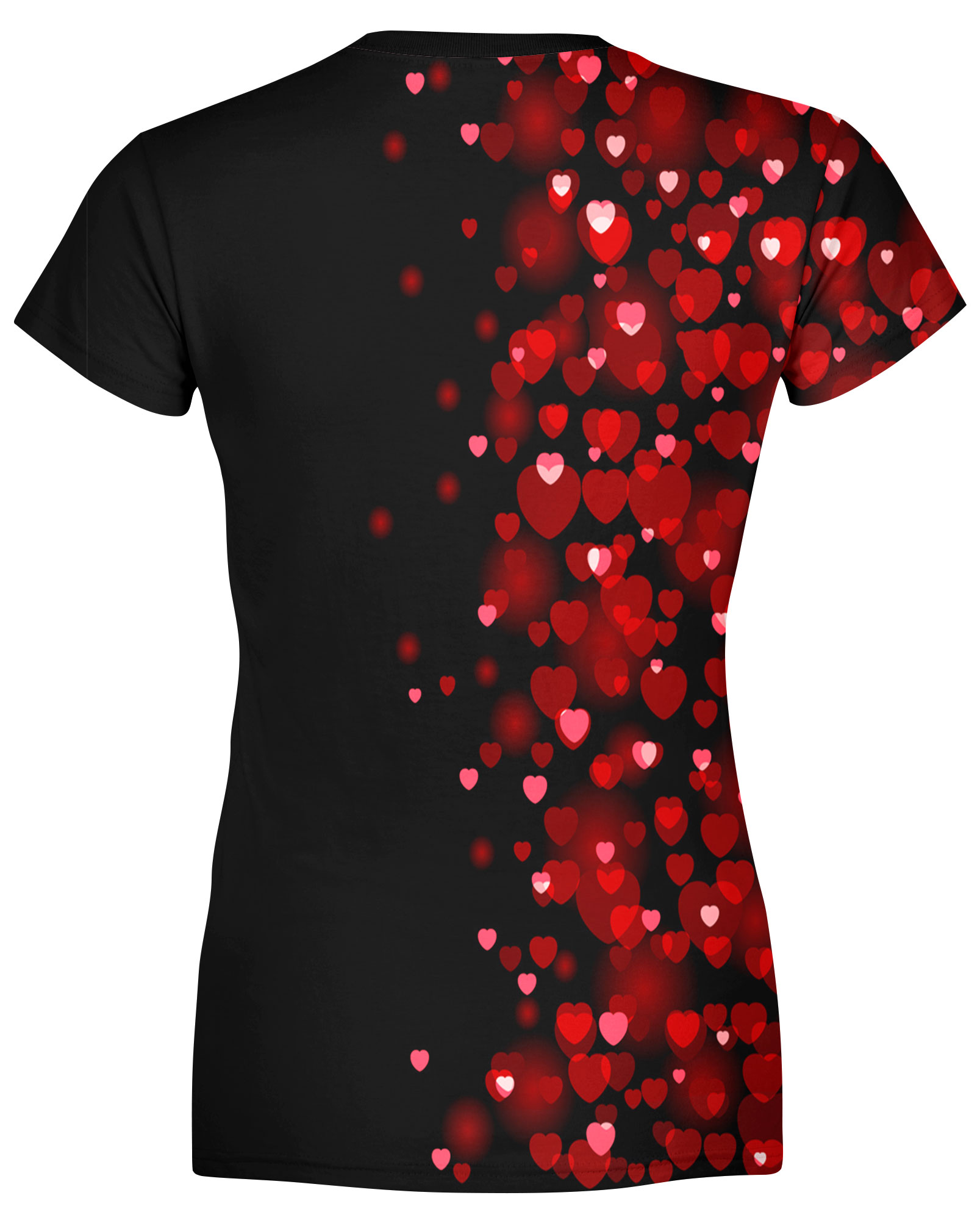 Playera Full Print Dama San Valentín Negra Corazones Rojos